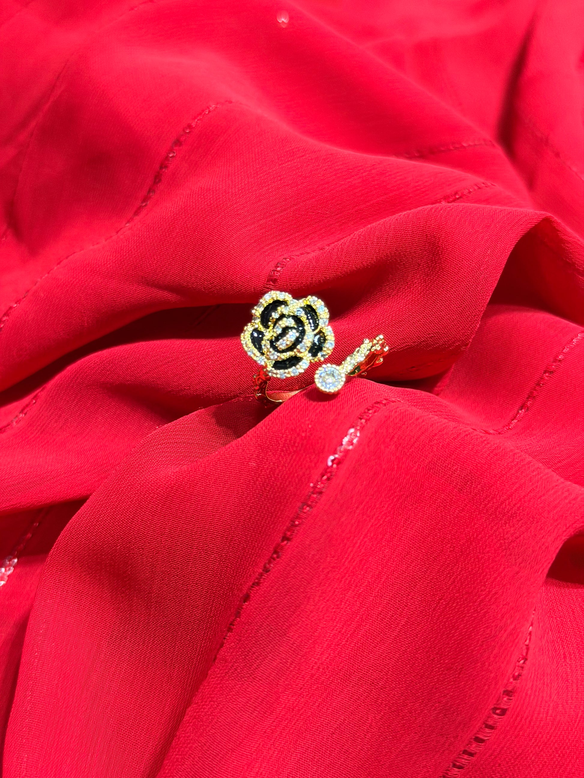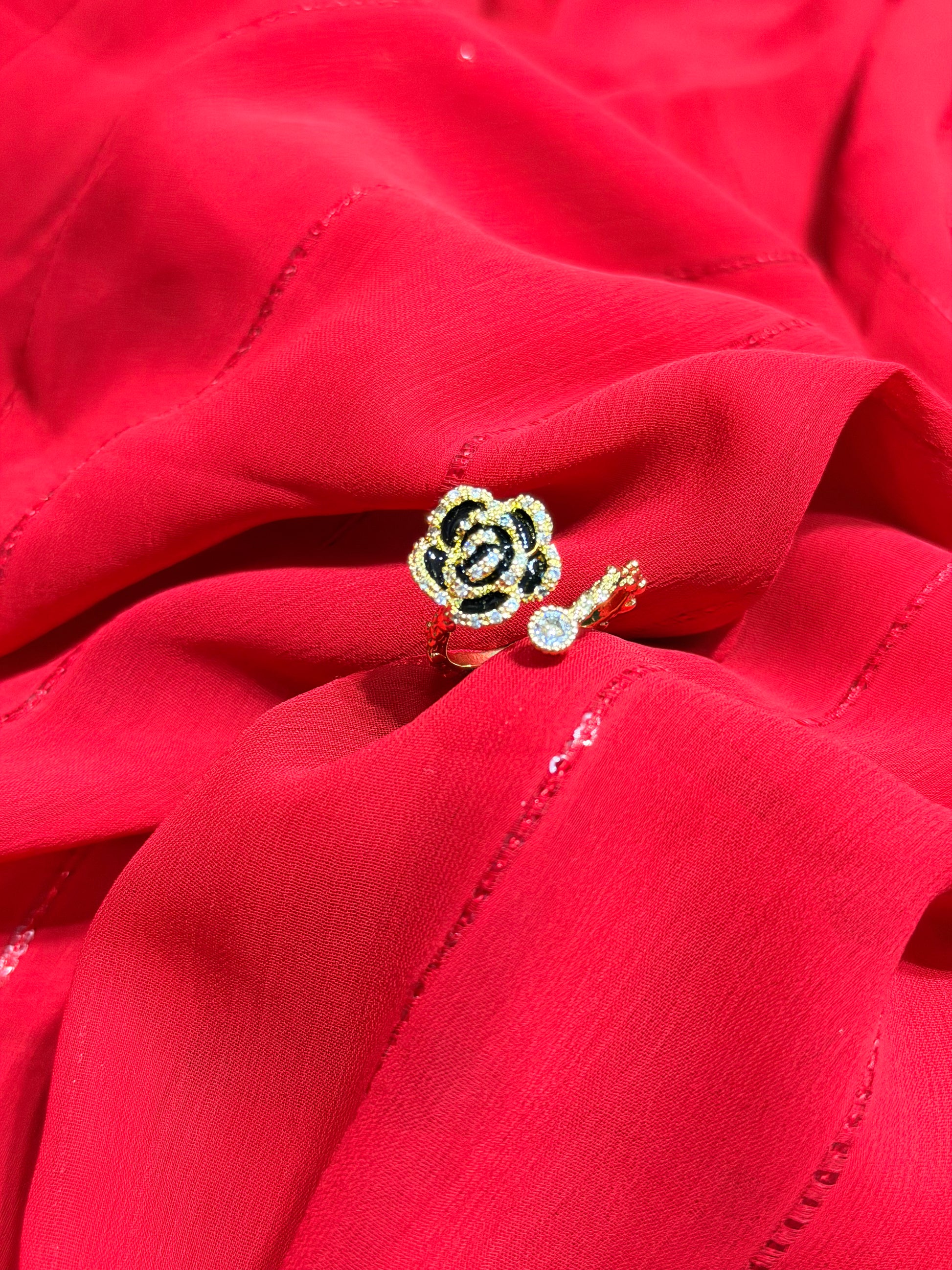 Black Camellia Flower With RhineStones Adjustable Gold plated Ring