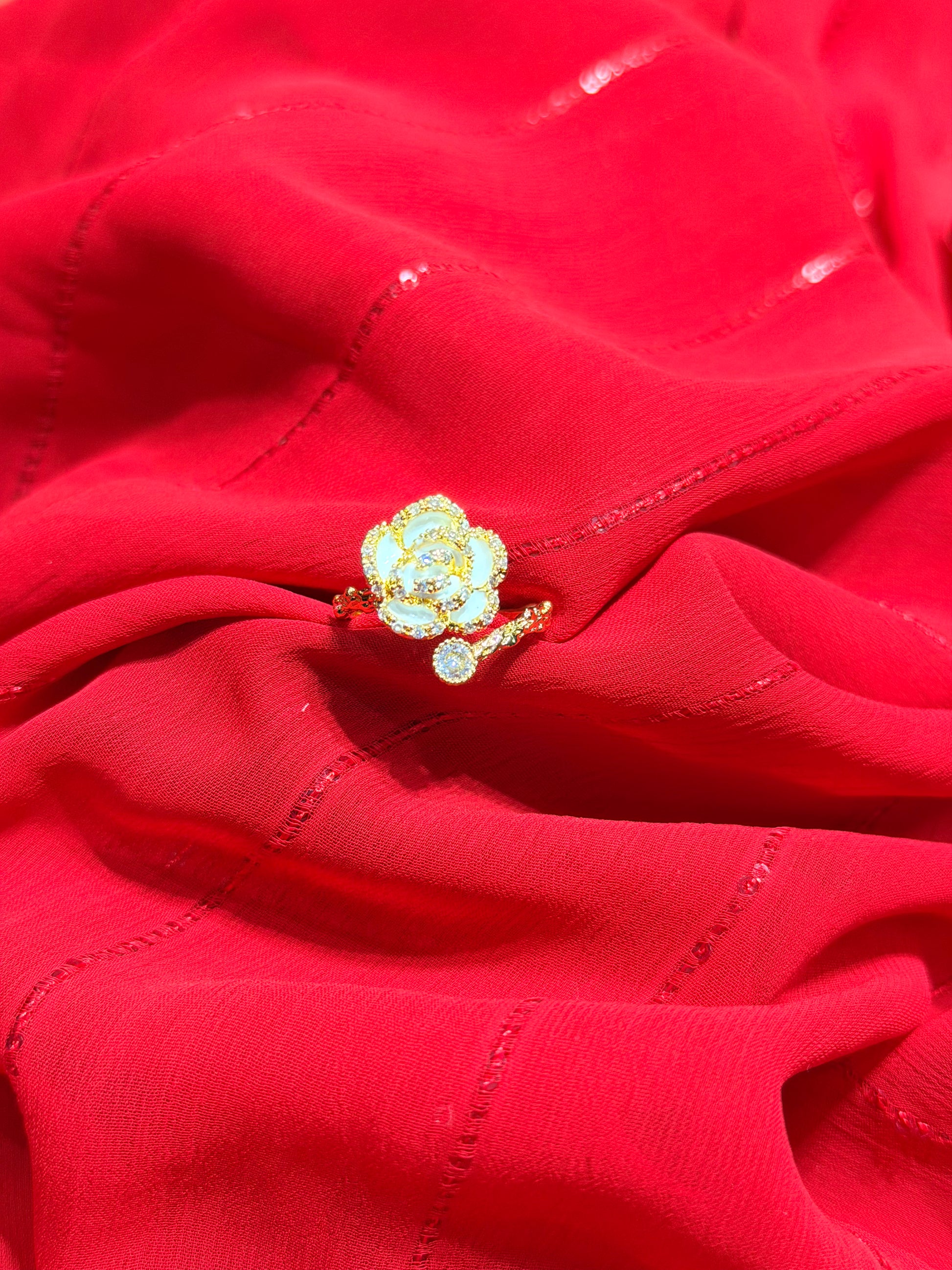 Elevate your everyday elegance with this exquisite Black Camellia Flower ring, where timeless botanical beauty meets contemporary sparkle. Crafted with gold plating and adorned with shimmering rhinestones, the intricately detailed camellia bloom creates a striking focal point that captures light beautifully. The adjustable design ensures a perfect fit for any occasion, making it a versatile addition to your jewelry collection. Whether worn as a statement piece or layered with other rings, this sophisticated accessory brings refined glamour to your personal style.