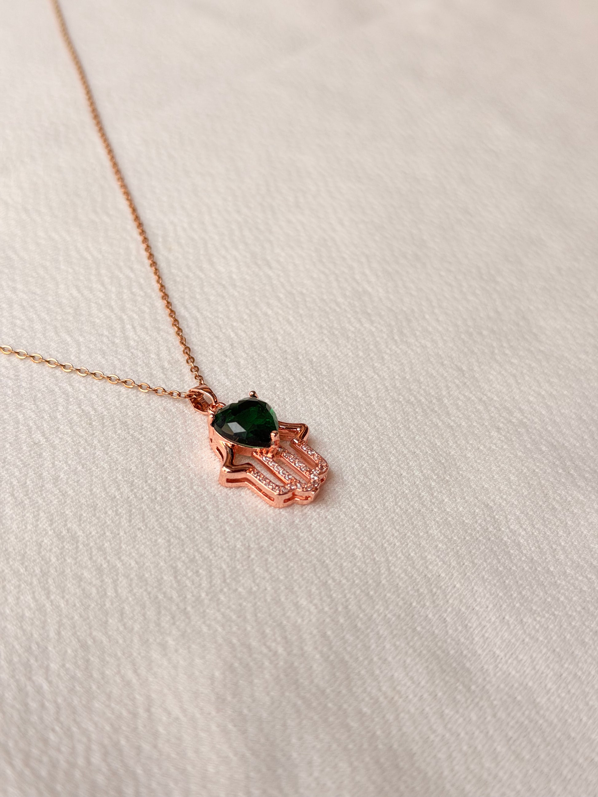 Hamsa hand with Green Stone Rosegold AntiTarnish Stainless Steel Chain Pendant